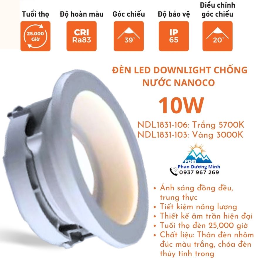 Thông số kỹ thuật của đèn LED downlight chống nước 10W Nanoco NDL1831-106 trắng